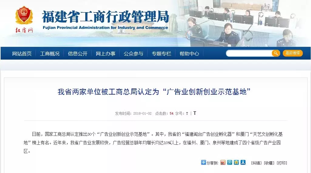 日前,在國家工商行政管理總局辦公廳出臺的《關(guān)于進(jìn)一步推進(jìn)廣告業(yè)創(chuàng)新創(chuàng)業(yè)有關(guān)工作的通知》(辦字【2017】209)中,由廈門市天藝傳媒股份有限公司創(chuàng)辦的“天藝文創(chuàng)孵化基地”被評定為國家級廣告業(yè)創(chuàng)新創(chuàng)業(yè)示范基地,成為廈門市2017年度唯一一家獲評廣告業(yè)創(chuàng)新發(fā)展優(yōu)秀典型企業(yè)的單位。